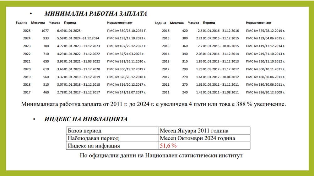 Друг компонент, който има отражение, е нарастването на минималната работна заплата, която в периода от 2011 до 2024 година е увеличена 4 пъти, което е 388 % увеличение.