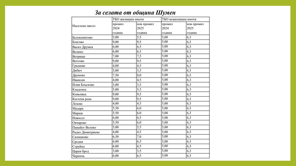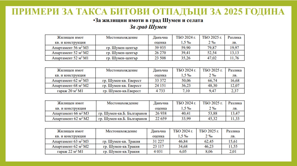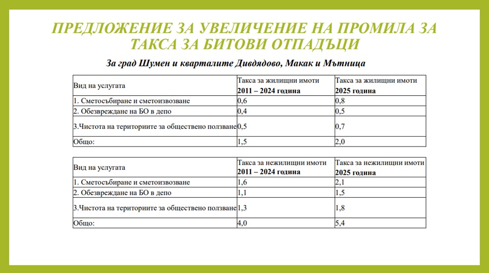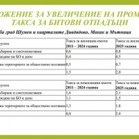 Размерът на такса битови отпадъци не е актуализиран от 2011 година. За жилищните имоти в Шумен и кварталите „Макак“, „Дивдядово“ и „Мътница“ планираното увеличение е от 1,5 на 2 промила върху данъчната оценка, а за нежилищните от 4 на 5,4 промила върху по-високата между данъчната им оценка и отчетната им стойност. Увеличаването за селата е 0,5 промила за жилищните имоти и 1,3 промила за нежилищните.