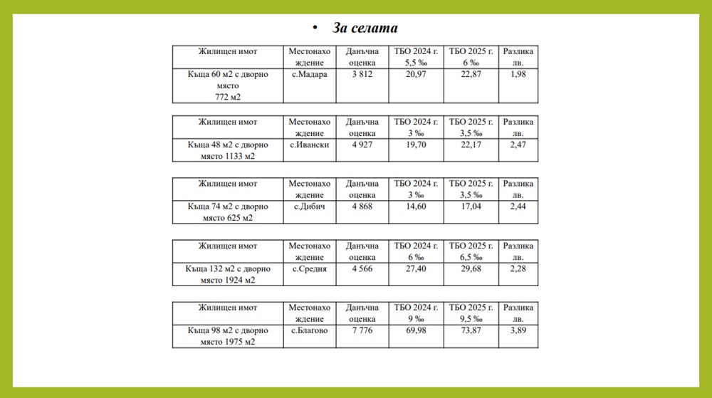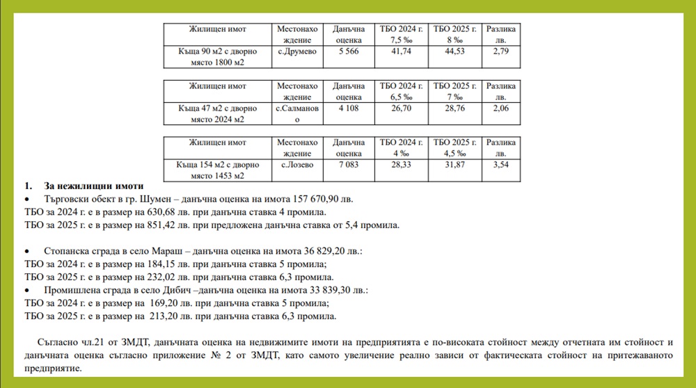 „В селата разликите са изключително малки, тъй като данъчните оценки на имотите са много ниски“, коментира началникът на отдел „Местни данъци и ТБО“ Ивелина Щерева. Тя обясни, че за нежилищните имоти на предприятията такса битови отпадъци се изчислява на по-високата от двете стойности – данъчната оценка и отчетната им стойност. Например за търговски обект в града с данъчна оценка на имота 157 670,90 лева, таксата ще се вдигне от 630,68 лева на 851,42 лева, като в изготвения от администрацията анализ има и примери за нежилищните обекти в селата.