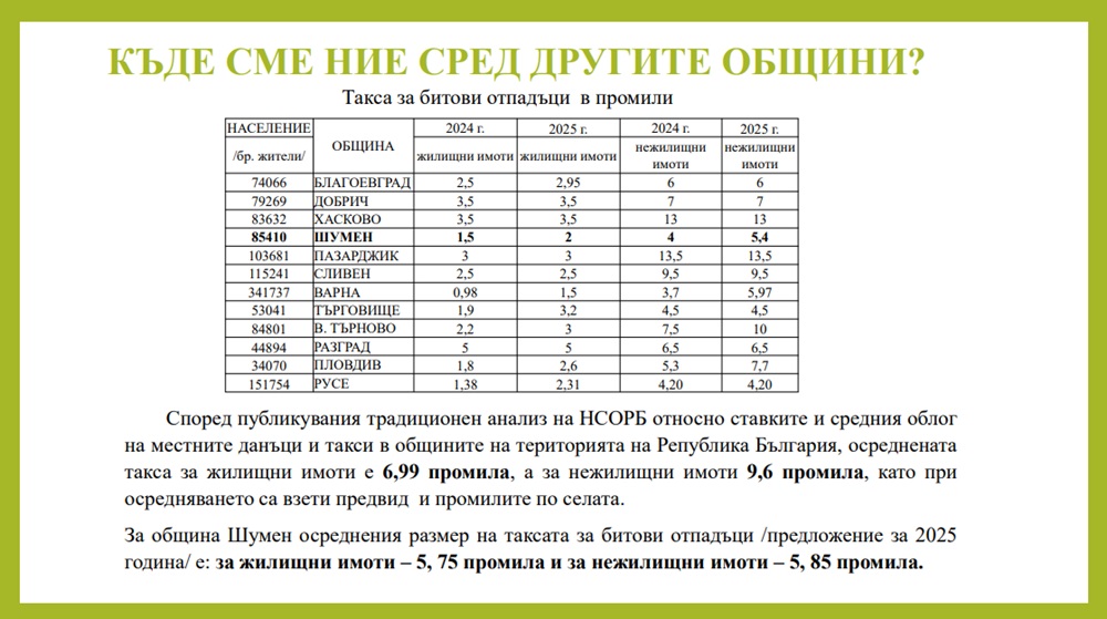 „Реално предвижданото увеличение на такса битови отпадъци на годишна база е в порядъка от 11 до 16 лева, което месечно се пада около 1,20 лева. А в селата максималното покачване е около 3 лева за година. Масово се пада около 20-25 стотинки на годишна база“, обясни кметът на Шумен проф. Христо Христов.