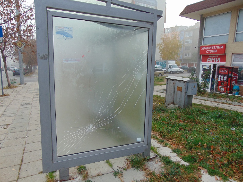 Броени дни, след като спирки за градския транспорт в Шумен бяха ремонтирани и нови осем бяха обновени с красиви фотоси, вандали отново потрошиха стъклени витрини и рекламни елементи. За пореден път обект на посегателство е автобусната спирка на бул. „Симеон Велики“ до Професионалната гимназия по икономика. Унищожена е една от страниците, а стъклото на рекламния елемент е счупено. Поражения има и върху други спирки, по които няма рекламни фотоси.
