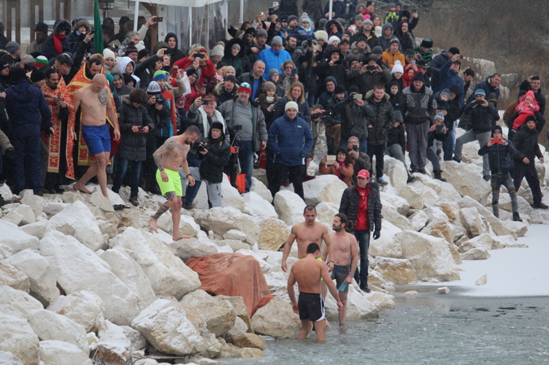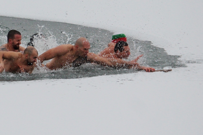 Кръста извади 27-годишният пожарникар Стефан Митев, а в ледените води на езерото се хвърлиха общо девет мъже.