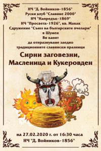 Сирни Заговезни, руската Масленица и Кукеровден ще отбележат днес, 27 февруари, четвъртък, от 16.30 часа в градинката пред концертната зала на читалище „Добри Войников” в Шумен.