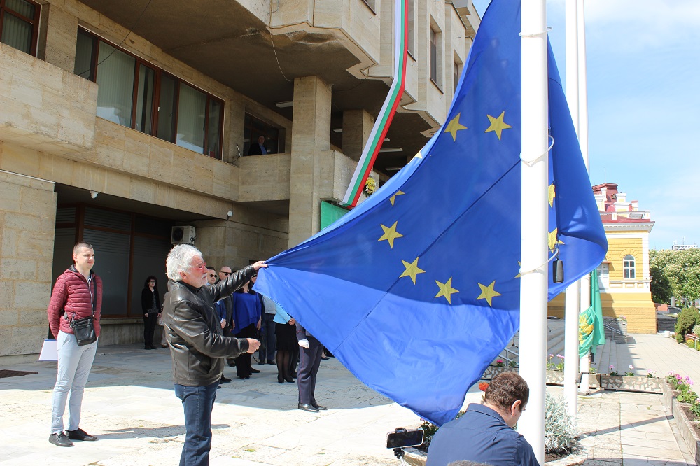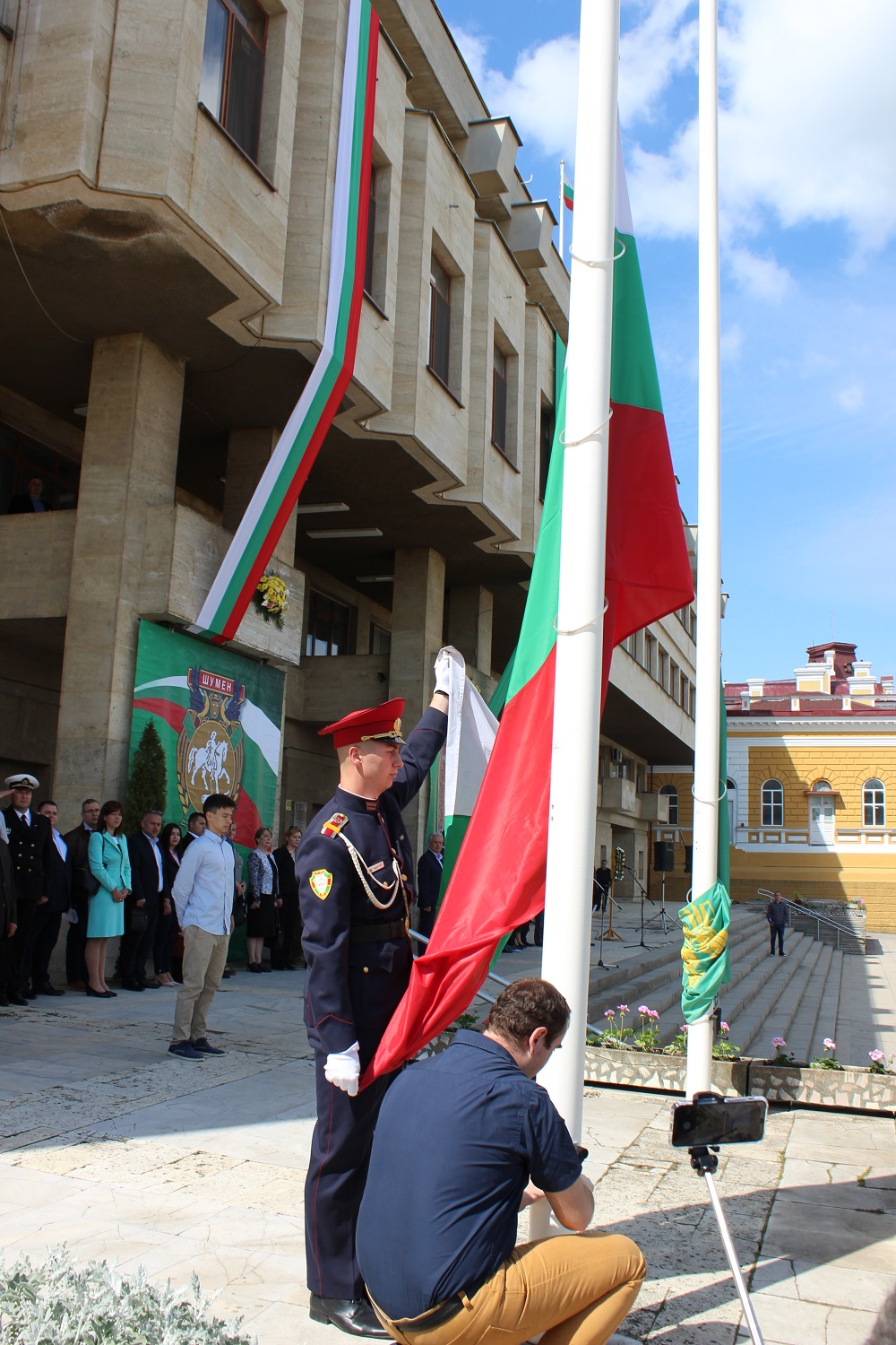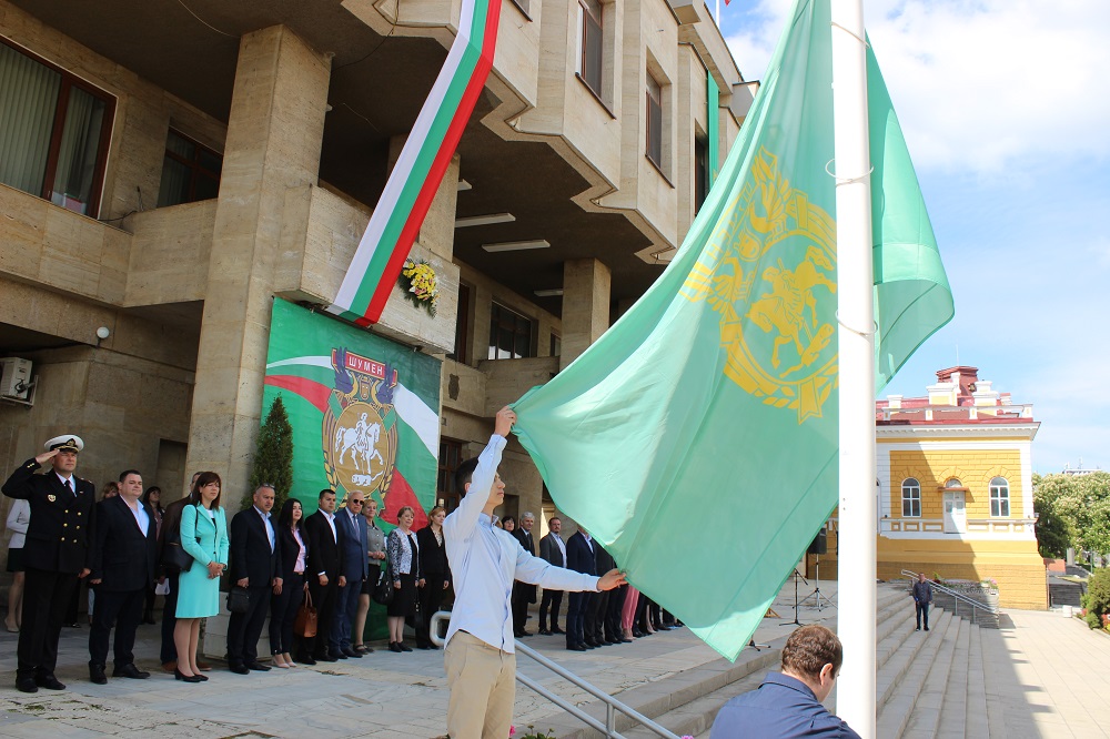 Пред сградата на общината бяха издигнати знамената на Република България, на Европейския съюз и на Шумен от Даниел Койнов, ученик от IX Б клас в ППМГ „Нанчо Попович“, Иван Радев, курсант старши сержант от Факултета „Артилерия, ПВО и КИС“ към НВУ „Васил Левски“ и проф. Валери Чакалов, преподавател в ШУ „Еп. К. Преславски“.