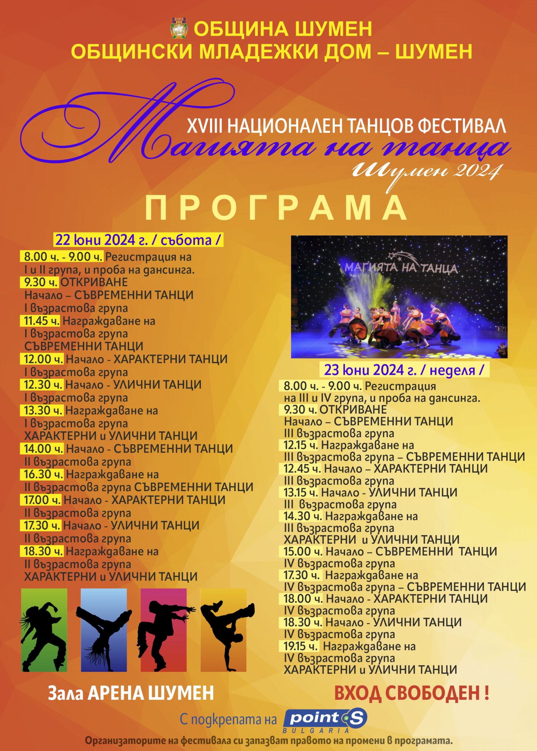 На 22 и 23 юни 2024 год. ще се проведе ХVIIІ-то издание на Национален танцов фестивал „Магията на танца“ Шумен 2024, организиран от Общински младежки дом – Шумен. Фестивалът се осъществява с подкрепата на Община Шумен. За пореден път красотата и блясъка на танцовото изкуство ще завладеят сцената в зала „Арена Шумен“. Целта на Фестивала е популяризиране на младежкото любителско творчество, обмяна на информация за развитие, нови стилове и постижения в различните танцови направления . Това е най-голямото събитие в нашия град, свързано с танцовото изкуство. Наложил се с авторитета и организацията си през годините, „Магията на танца“ е предпочитан форум от състави и формации, от цялата страна. Фестивалът отново е предпочетен от голям брой танцови формации от цялата страна. Участниците във Фестивала ще се състезават в четири възрастови групи и ще се представят в три танцови жанра – съвременни, характерни и улични танци.