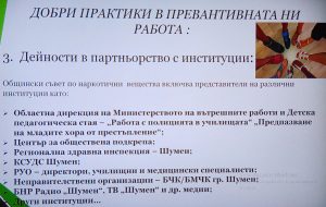 На заседание на Общинския съвет по наркотични вещества беше извършен отчет на дейността за изминалото шестмесечие. Срещата откри д-р Светослава Хайнова, зам.-кмет по “Социална политика и здравеопазване”. Дейността на Общинския съвет по наркотични вещества и Превантивно-информационния център към Община Шумен е регламентирана в Закон за контрола върху наркотичните вещества.