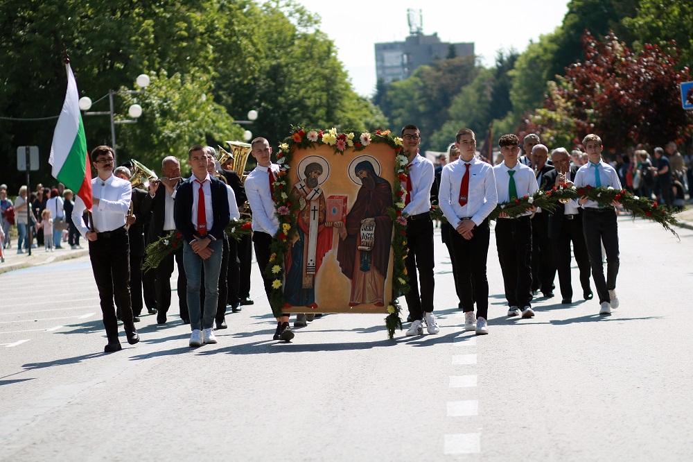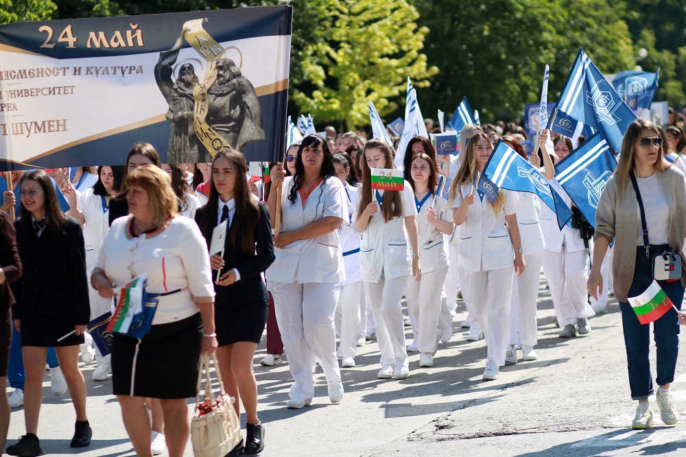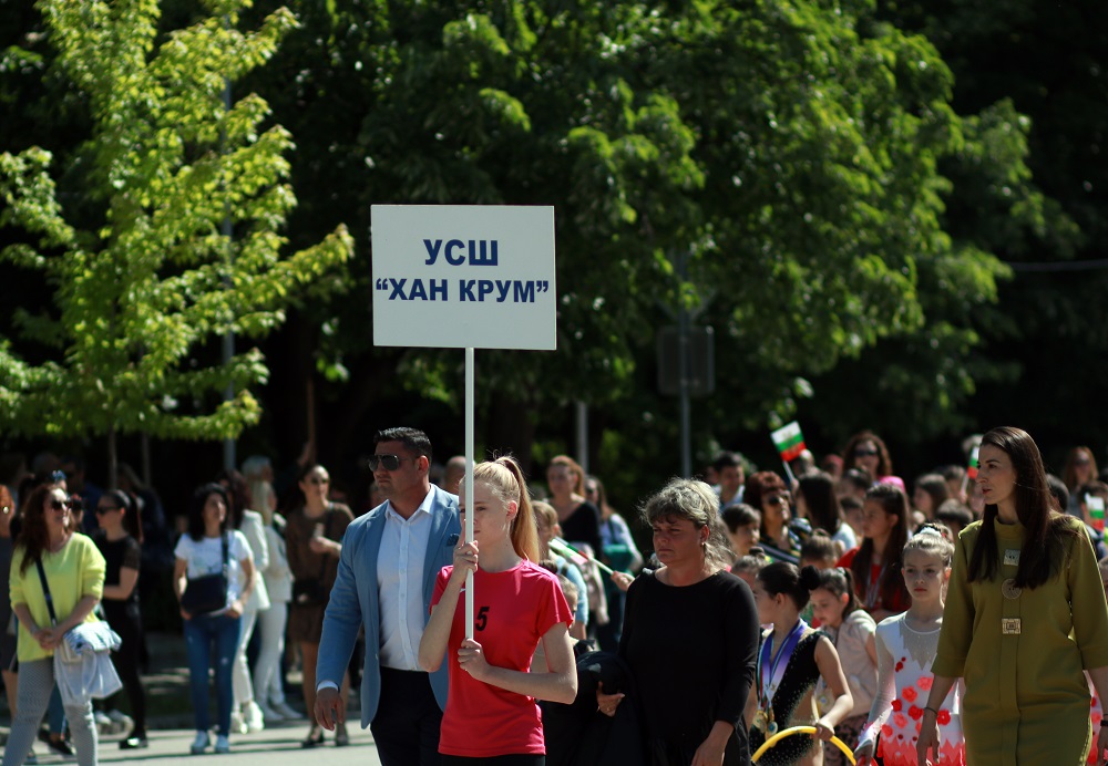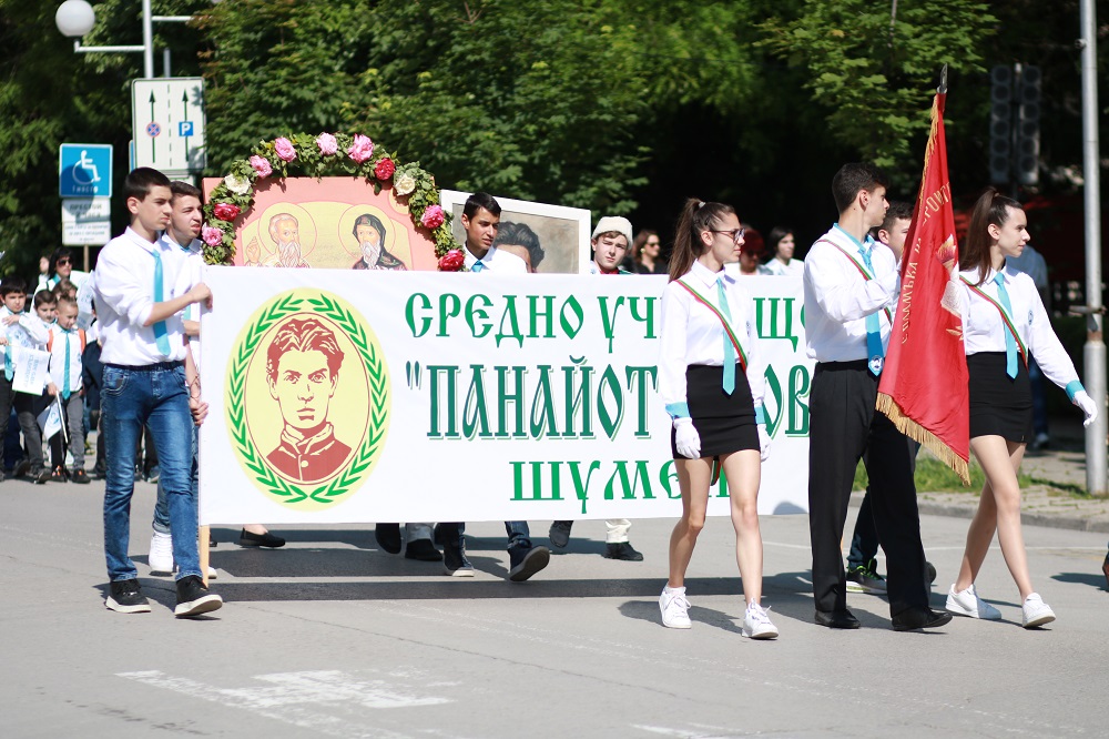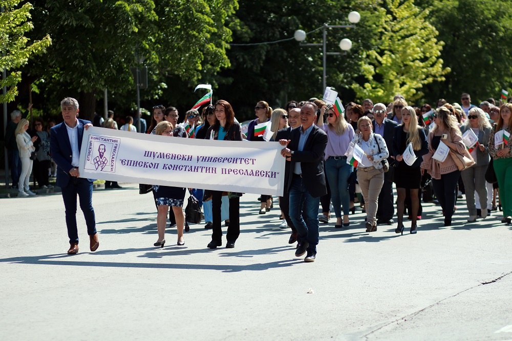 Хиляди деца и родители, учители и ученици, студенти, университетски преподаватели, просветни и културни дейци се включиха в празничното шествие, организирано от Община Шумен по случай 24 май – Деня на светите братя Кирил и Методий, на българската азбука, просвета и култура и на славянската книжовност. По традиция шествието, начело с иконата на Св. Св. Кирил и Методий, тръгна от площад „Кристал“ и премина по булевард „Славянски“ до сградата на Община Шумен. Под звуците на химна на 24 май „Върви, народе, възродени“ централната част на града се изпълни от пищното шествие, в което участваха представителни блокове на висшите учебни заведения в града, детски градини, училища, читалища, просветни и културни организации, спортни клубове и школи по интереси. В шествието се включиха кметът Любомир Христов, областният управител проф. Христо Христов, народният представител Нели Димитрова, председателят на Общинския съвет Ася Аспарухова, заместник-кметове и общински съветници.