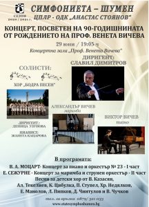 Симфониета Шумен под диригентството на Славил Димитров и детският хор „Бодра песен“ с диригент Деница Узунова и пианист Жанета Кацарова организират съвместен концерт, посветен на 90-годишнината от рождението на проф. Венета Вичева – виден хоров деятел и почетен гражданин на Шумен.