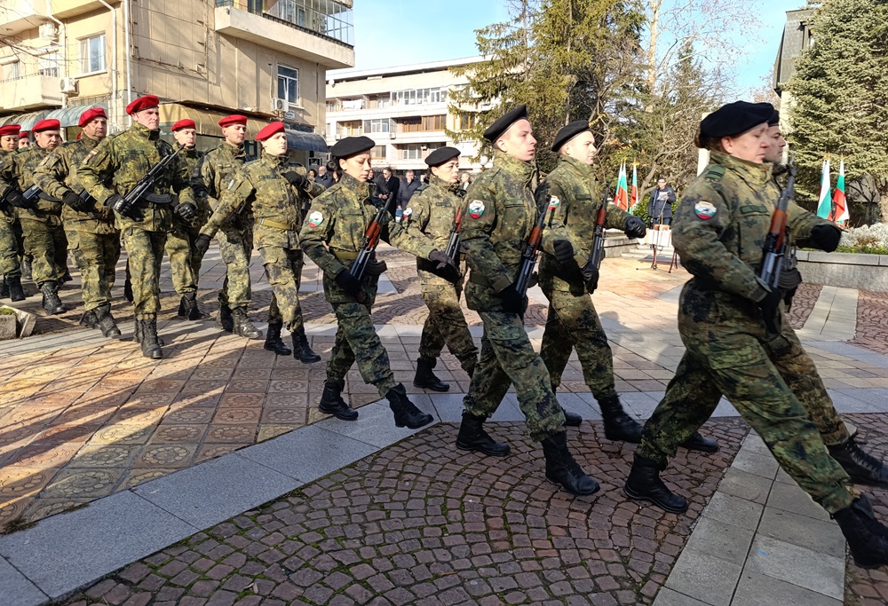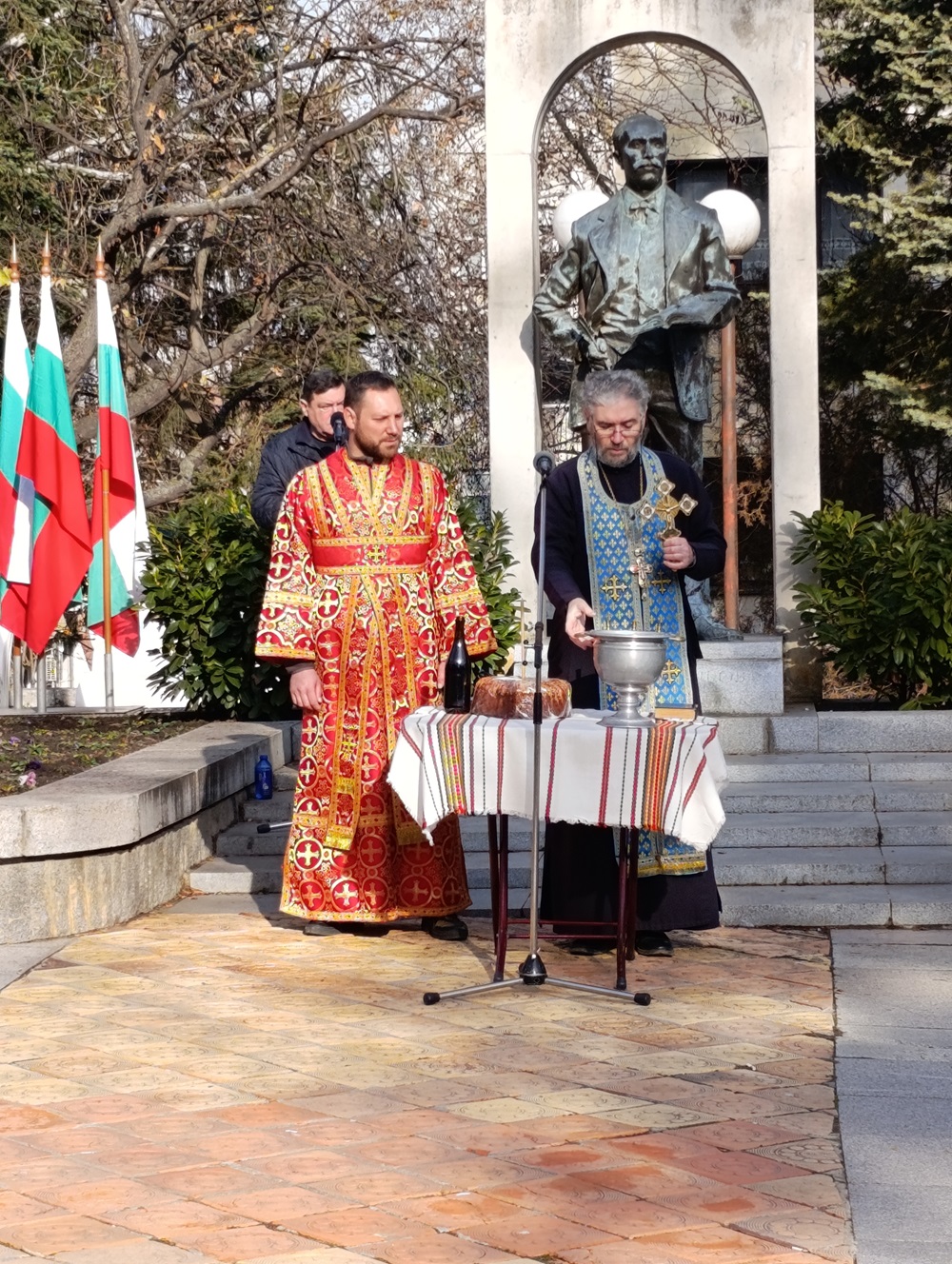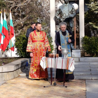 Празничният водосвет беше отслужен от свещеноиконом Красимир Капитанов, който прочете молитва за здраве и благоденствие и поръси със светена вода българските бойни знамена.