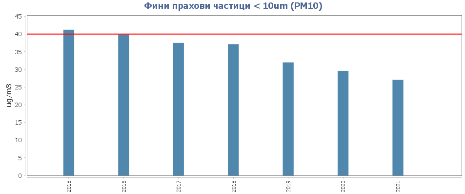 Статистиката показва, че през 2021 г. средногодишната концентрация на ФПЧ10 е малко под 25 mg/m3, т.е. значително под средногодишната норма от 40 mg/m3. За сравнение през 2015 г. средногодишната концентрация на фините прахови частици е била малко над 41 mg/m3. През следващите години се наблюдава постоянно и трайно намаление. Отчита се намаляване и на броя на превишенията на среднодневната норма от 50 mg/m3. Ако за 2015 година превишенията са били 66, то за 2021-ва вече са само 18 броя при допустими 35 за година.