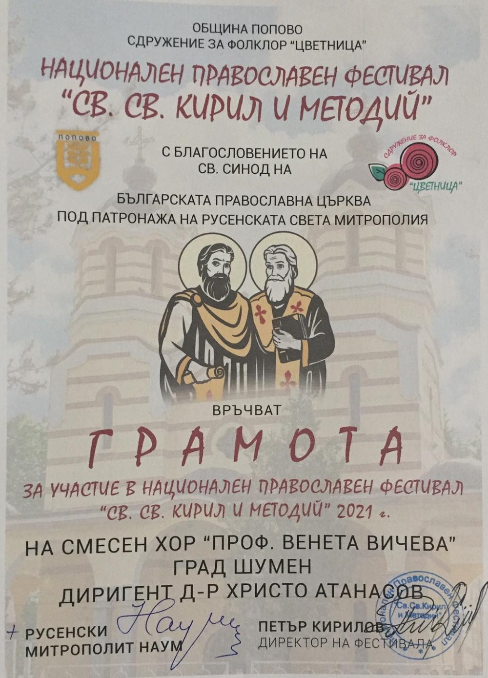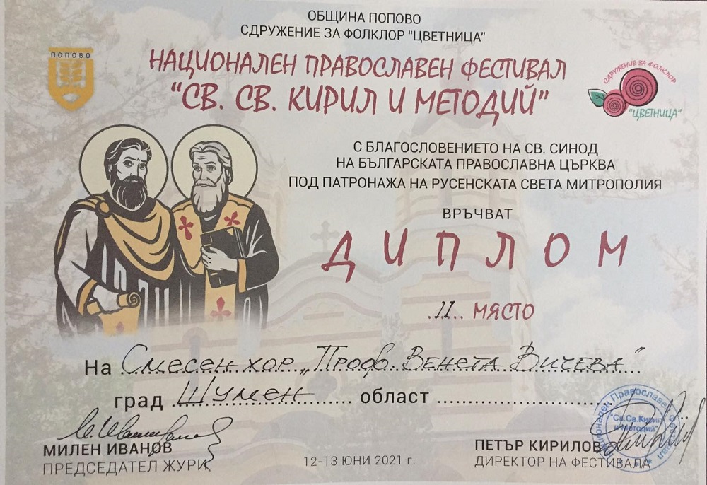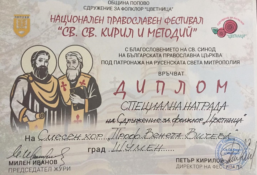 Шуменският хор бе отличен с Втора награда от конкурсната програма на Третия национален православен фестивал “Св. Св. Кирил и Методий” в Попово.