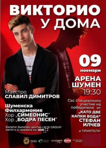 18-годишният шуменец Викторио Ангелов, който е единственият българин, участвал в „Х Фактор – Финландия“, ще пее на 9 ноември от 19.30 часа в зала „Арена Шумен“. Концертът е под надслов „У дома“ и в него ще се включат Шуменската филхармония, хоровете „Симеонис“ и „Бодра песен“, МеРок бенд и победителят от шоуто „Като две капки вода“ Стефан Илчев. Диригент на спектакъла ще бъде маестро Славил Димитров.