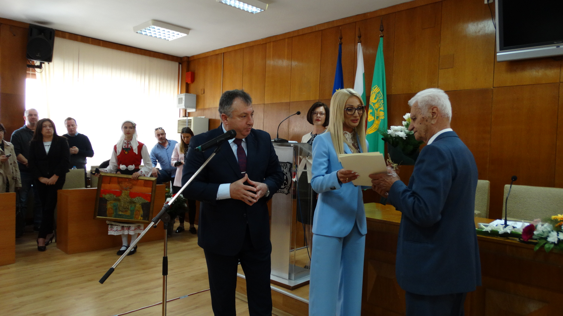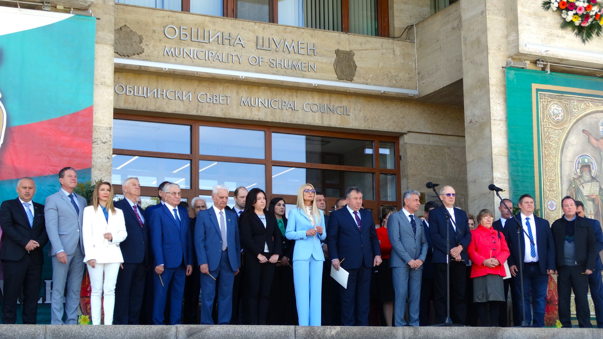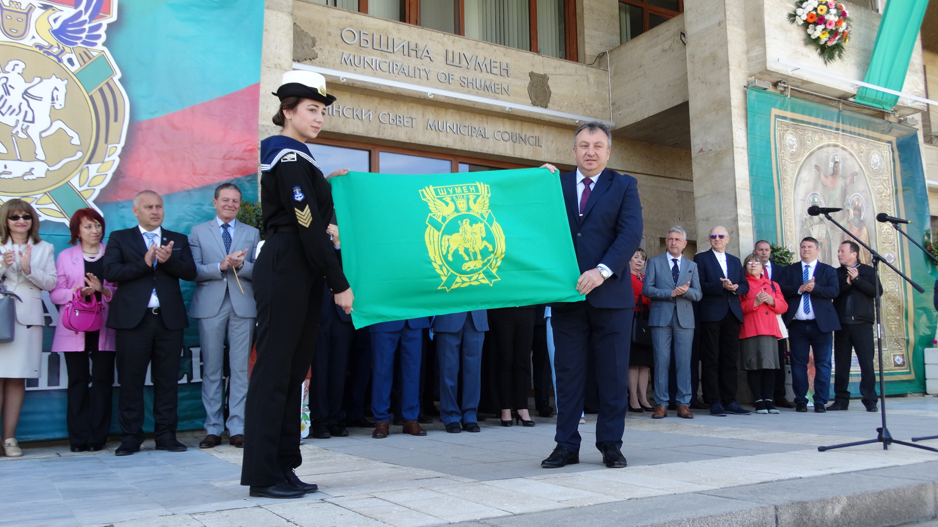 Честта да издигне знамето на град Шумен заслужи Красимир Савов – хореограф-режисьор. Награден с орден Кирил и Методий – първа степен, Кристално огърлие на Съюза на българските музикални и танцови дейци, Златна кобилица на CIOFF – България, Златен плакет на банатските българи от Винга, спечелил сребърна и златна брадви на конкурса в Закопане – Полша и Почетен гражданин на град Шумен. Съгражданката ни – курсант главен старшина Анна Стоянова – член на екипажа на научноизследователския кораб “Св. св. Кирил и Методий”, който плава на мисия до Антарктида, върна на кмета знамето на Община Шумен, развято в българската база на остров Ливингстън.