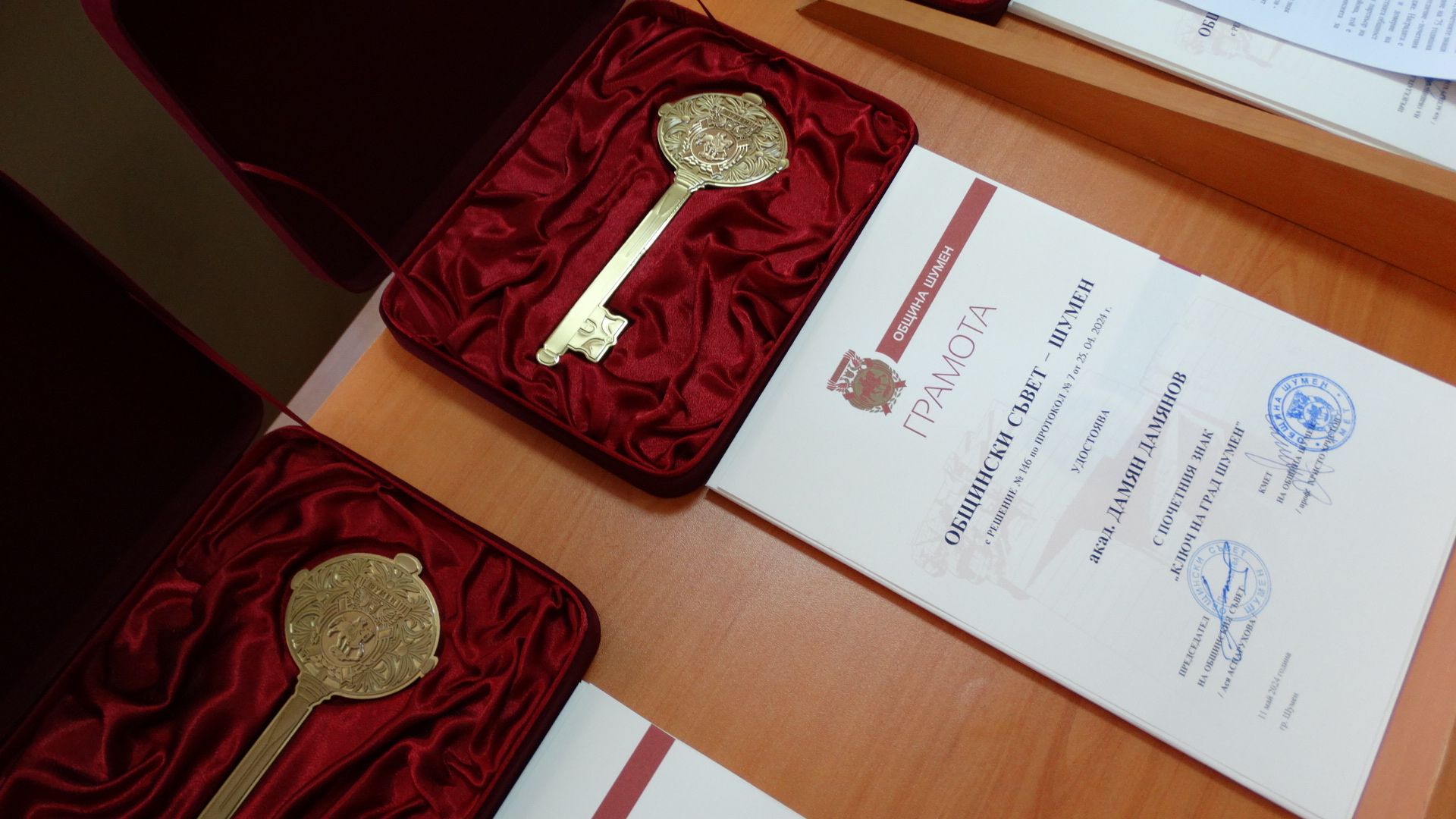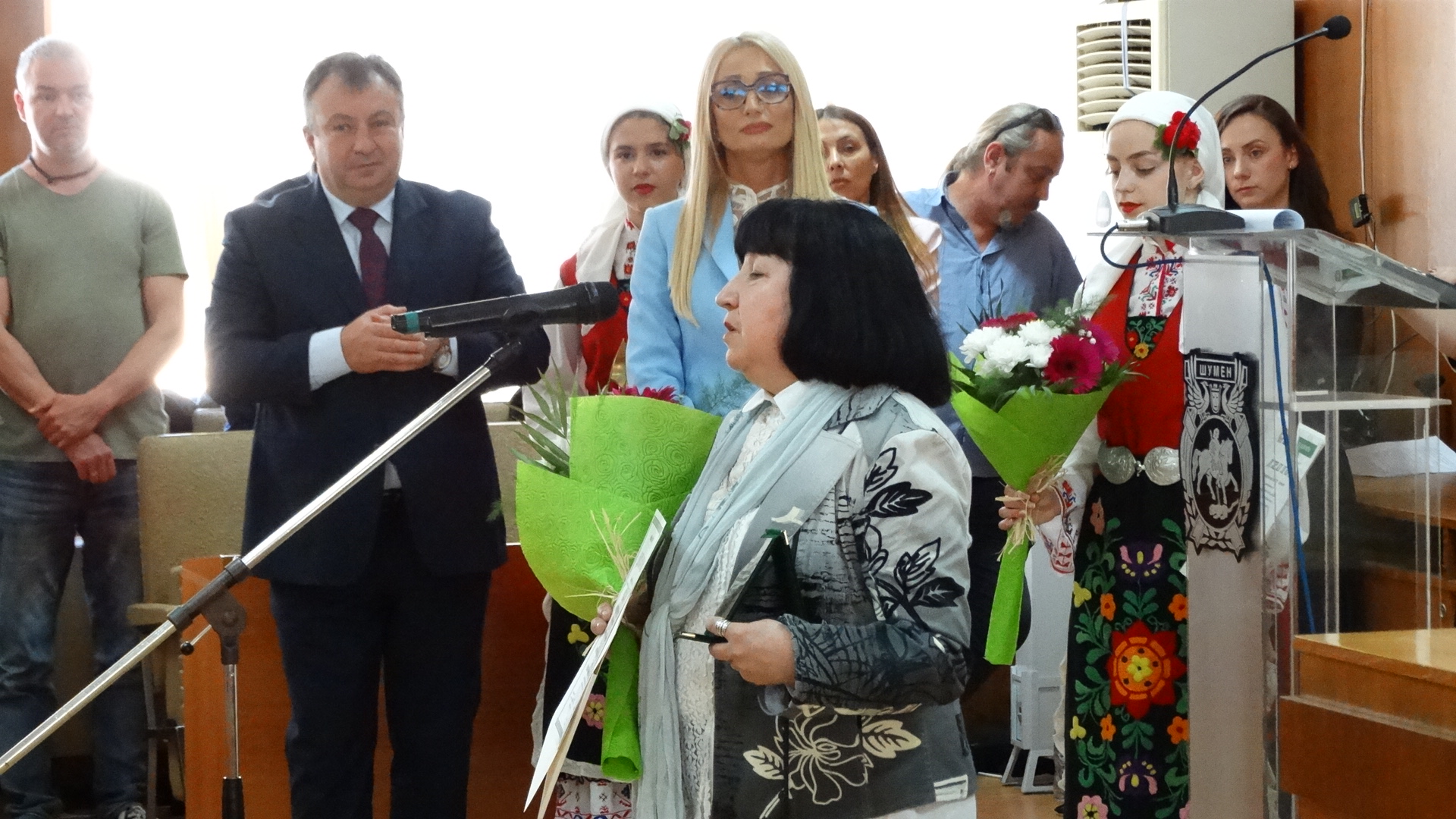 В 11.00 часа, в зала 363 започна тържествената сесия на Общинския съвет, открита от председателя Ася Аспарухова. Тя призова присъстващите с думите: „Нека живеем отговорно с мисъл за днес и утре, с достойнство да пазим и предаваме на идните поколения традициите си, обединени от отговорността да съградим достойно бъдеще за децата ни. Нека обичаме и пазим своя роден град, да го развиваме и градим авторитета му, да бъдем единни и мъдри при решаване на значими за него въпроси.“ Кметът проф. Христо Христов също поздрави присъстващите в залата. „Ние, днешните шуменци, следваме волята на нашите първоучители и честваме 11 май за Ден на града ни. Така повелява традицията. От дълбока древност земите на шуменския край се намират на исторически кръстопът. Учени от световна величина признават, че в Шумен и прилежащият му район са съсредоточени останки от богата духовна и материална култура. Това е времето на първите български ханове и царе, избрали Плиска и Преслав за столици на новооснованата държава. Тук са корените на християнската религия и книжовност, дала на народа ни вяра и писмо, за да я разпространяват на други народи“, каза Христов. Поздравителни адреси до Община Шумен и Общинския съвет изпратиха президентът на Република България – Румен Радев, председателят на НСОРБ – Даниел Панов, директорът на Радио Шумен Ангел Трайков и кметове на общини. Почетният гражданин на Шумен Фикрет Индже беше удостоен с най-голямата награда Почетен знак „Ключ на град Шумен“. На тържествената сесия днес по повод Деня на Шумен, кметът проф. Христо Христов и председателят на Общинския съвет Ася Аспарухова връчиха наградите за изкуство и култура.