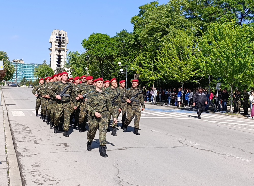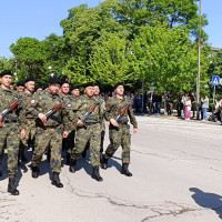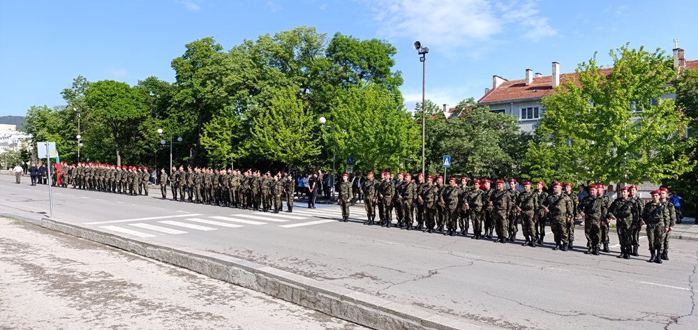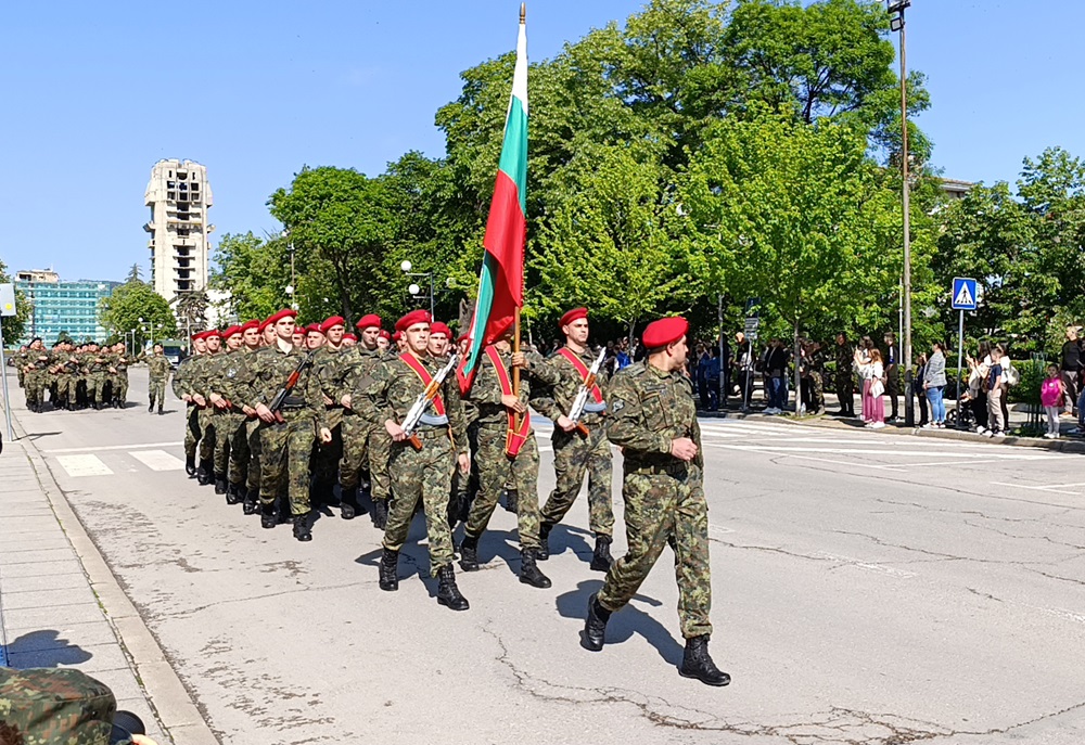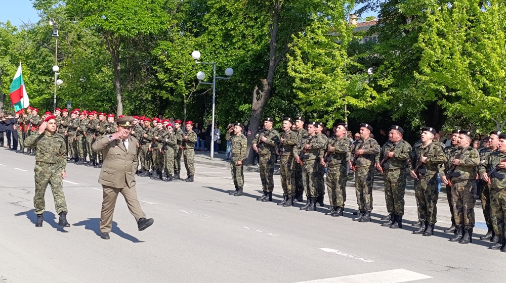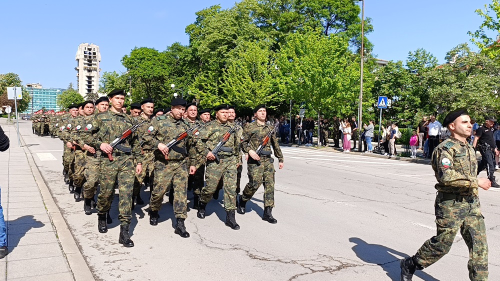Шуменският военен гарнизон премина в тържествен марш на представителните блокове от военните формирования 34 200 и 54 060, както и от военния факултет „Артилерия, ПВО и КИС“ в Шумен.