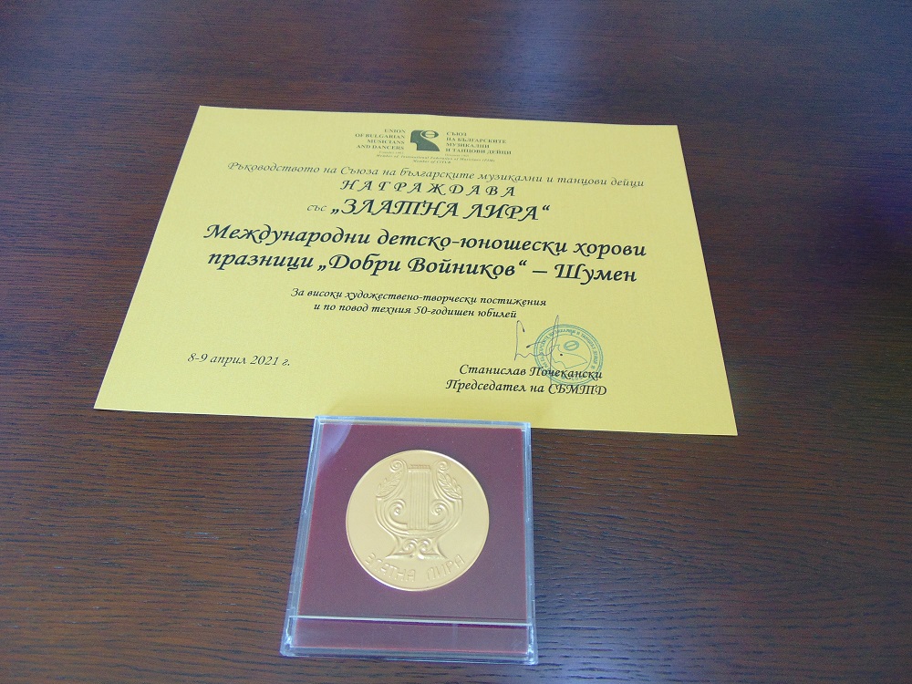 Съюзът на българските музикални и танцови дейци награди със „Златна лира“ Международните детско-юношески хорови празници „Добри Войников“ – Шумен. Най-високото отличие за принос, значими художествено-творчески постижения и по повод 50-годишния юбилей на фестивала бе връчено от Славил Димитров, председател на Българския хоров съюз и диригент на Националния филхармоничен хор „Светослав Обретенов“. Златен плакет и грамота получиха кметът Любомир Христов, под чийто патронаж се провеждат хоровите празници, и Деница Узунова, диригент и главен художествен ръководител на хор „Бодра песен“ при ЦПЛР-ОДК „Анастас Стоянов“ –  основен организатор и вдъхновител на фестивала. Хоровите празници тази година се проведоха онлайн на 8 и 9 април.